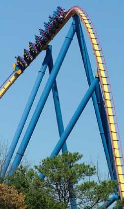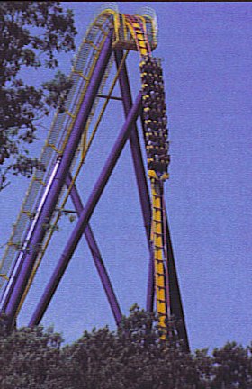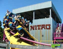 News & Notes:  The tallest and fastest coaster in the history of Great Adventure and one of the largest in the world made its debut in the spring of 2001.    Nitro opened with the park, despite a bitterly cold Winter, and was launched with a Survivor style contest for the first ride.    Nitro was the park's third collaboration with Bolliger & Mabillard, designers of Batman the Ride and Medusa, and was an immediate sensation.